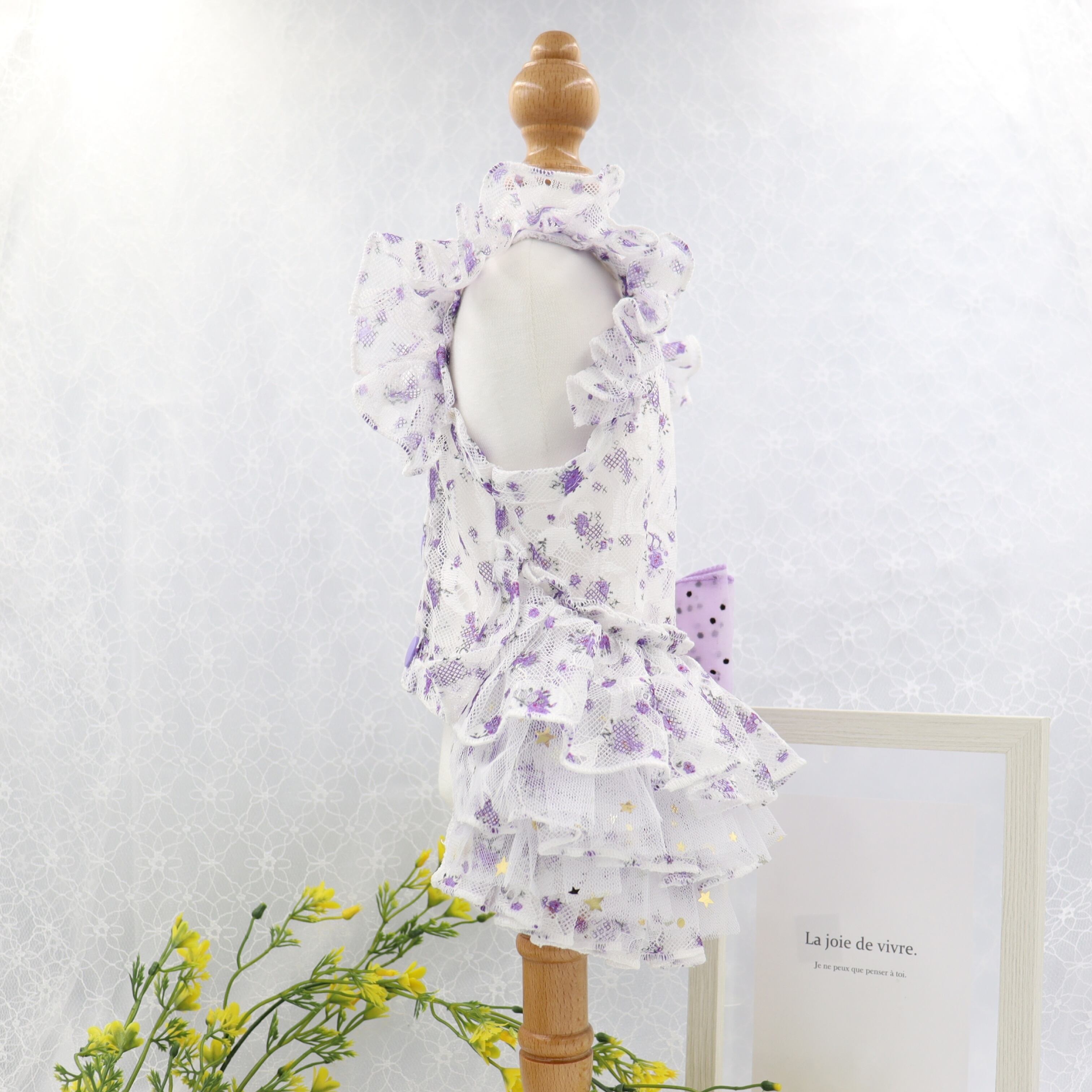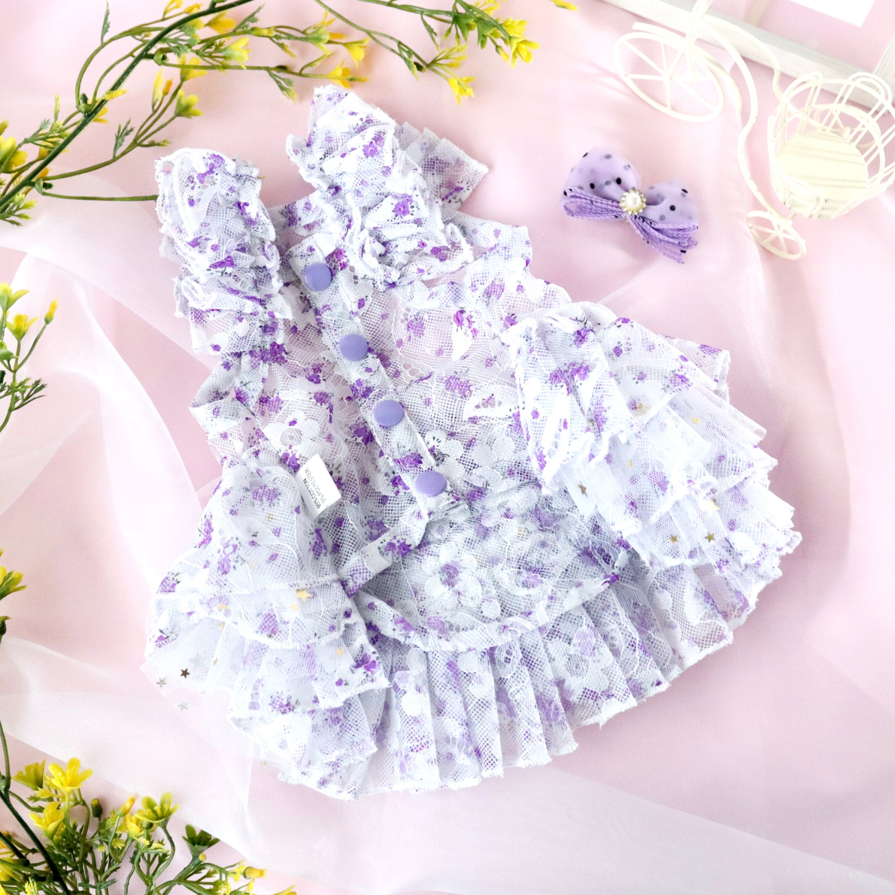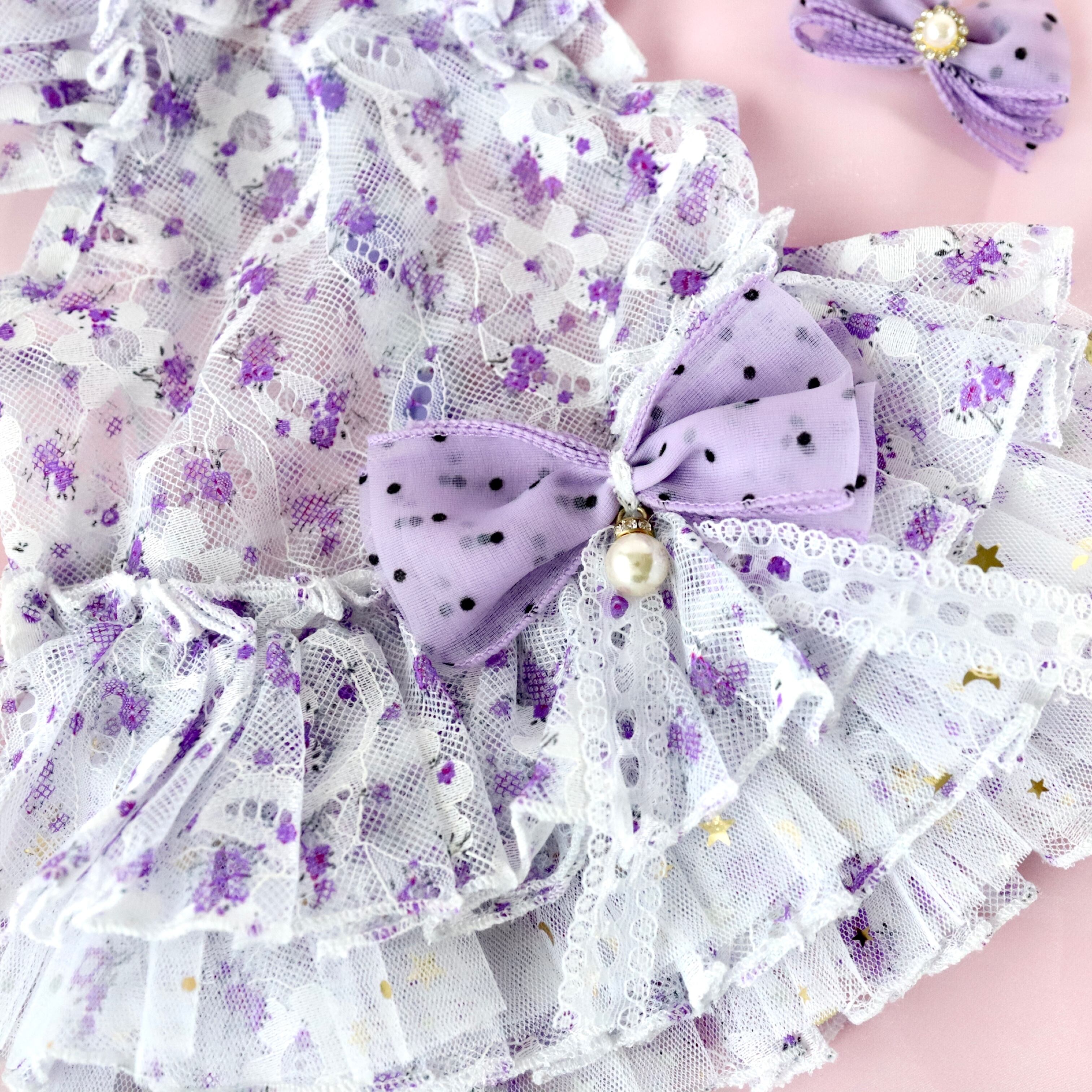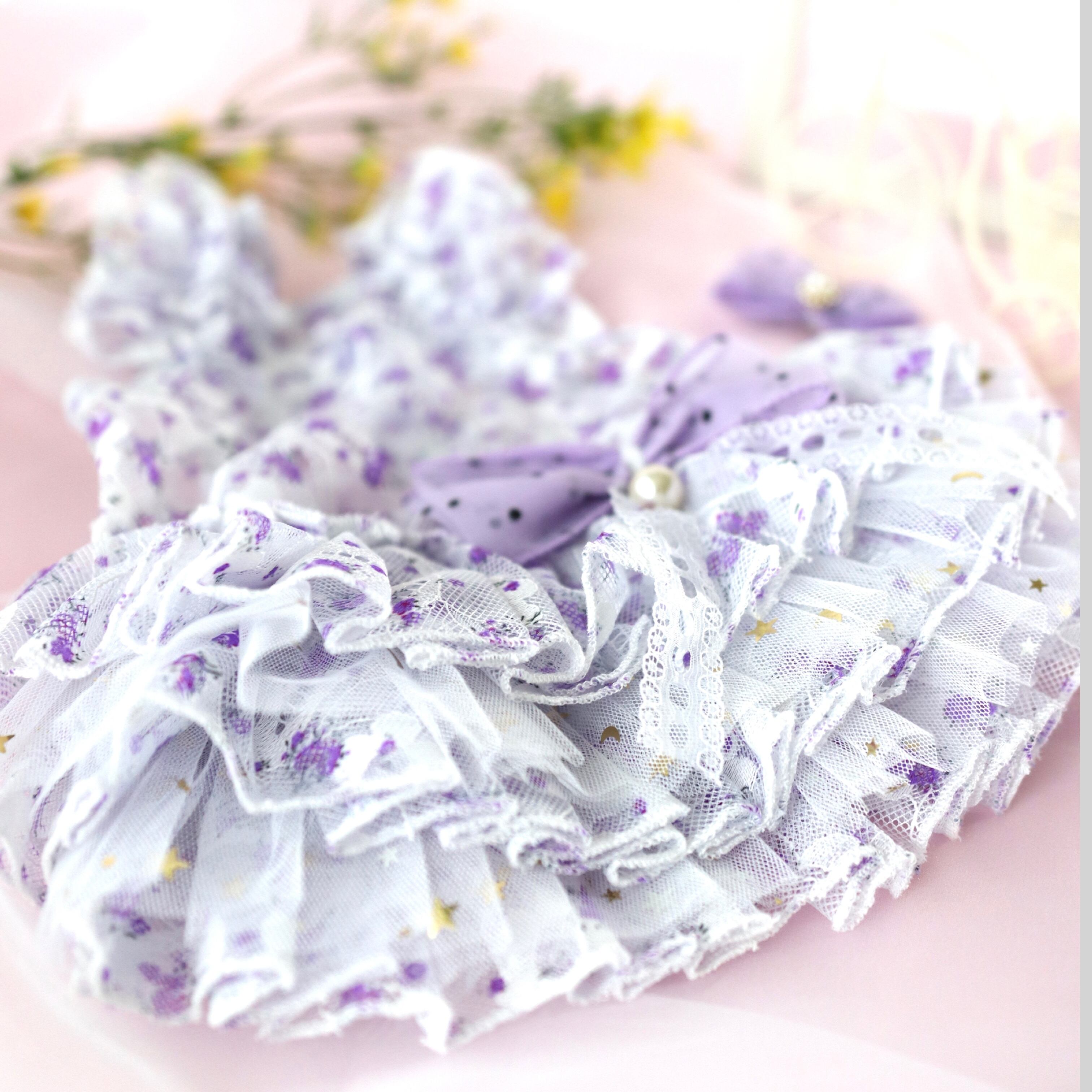 また5段重ねになったスカート部分は、星柄のパープルカラーのチュール生地も重ねていますので、ボリューム感もあり華やかなワンピースになってます♪